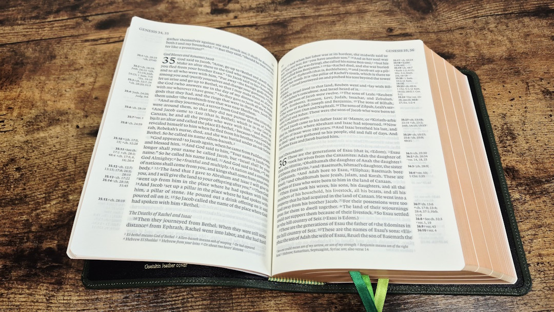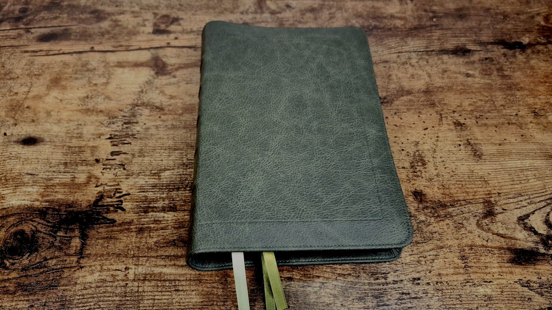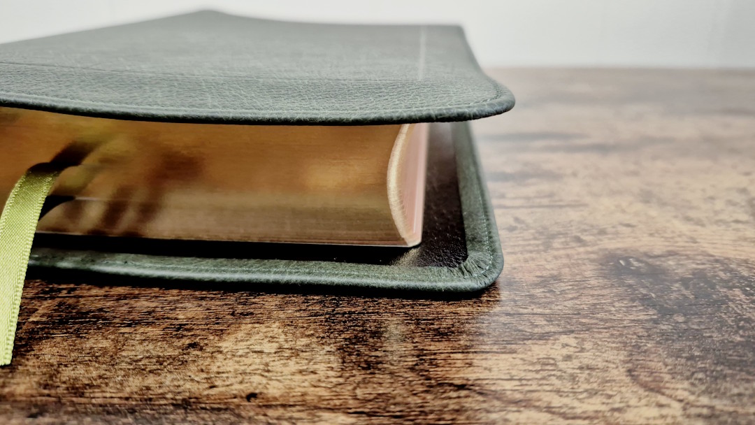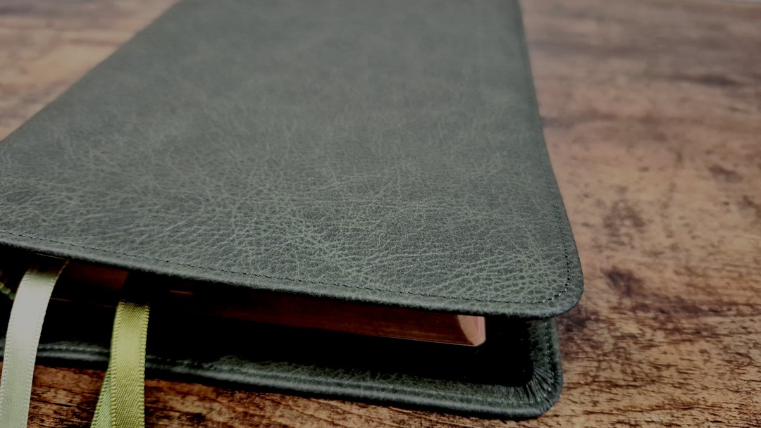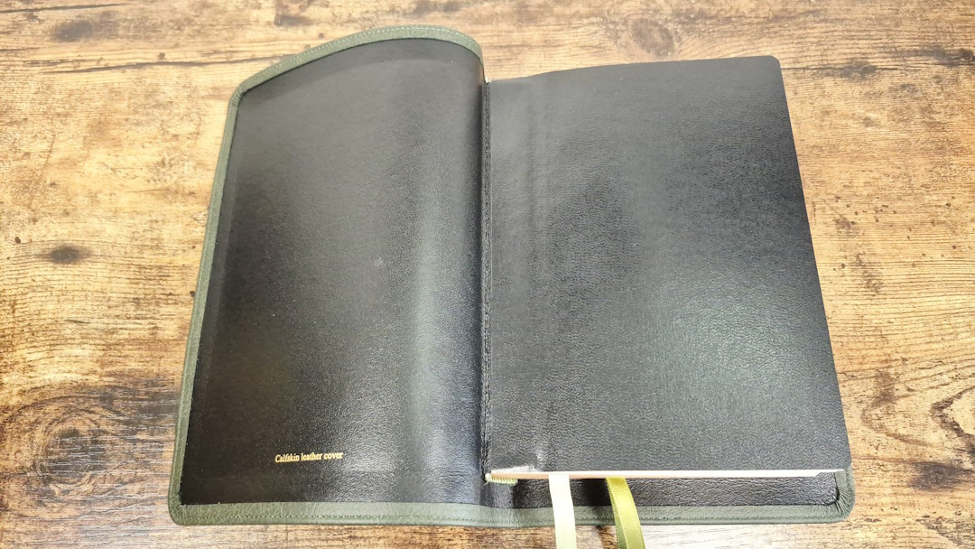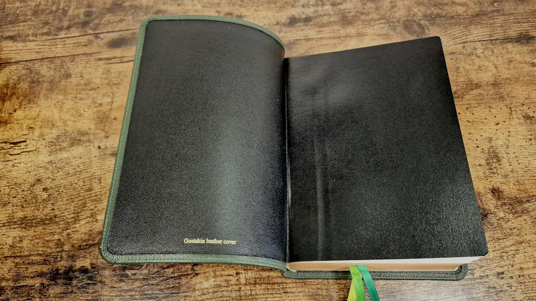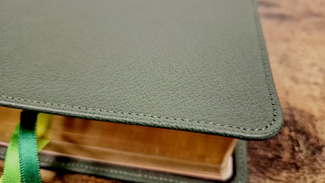 Aside from the liner, the green goatskin leather looks and feels like the other goatskin Clarion editions. It’s a more solid green than the calfskin on the KJV, so it’s closer to olive, but it’s still darker than olive. Like the other goatskin Clarions, this one does not have a yapp. The grain is pebbly, and it’s the same thickness as the calfskin. It’s soft and flexible, but not as soft and flexible as the calfskin editions. It includes perimeter stitching with a green thread that matches the cover. The spine has 5 non-raised hubs and gold printing.