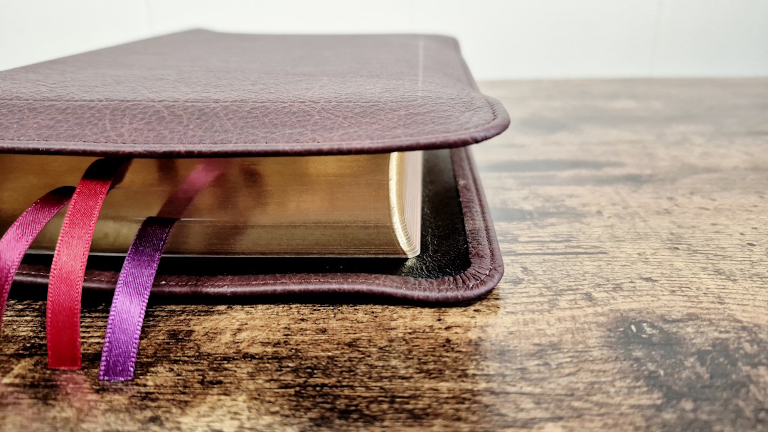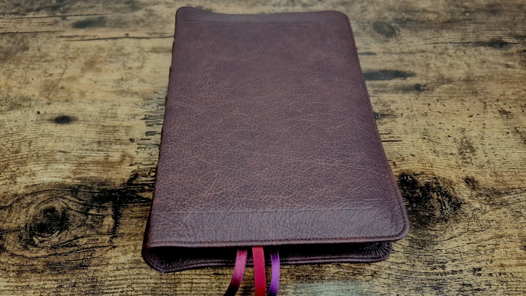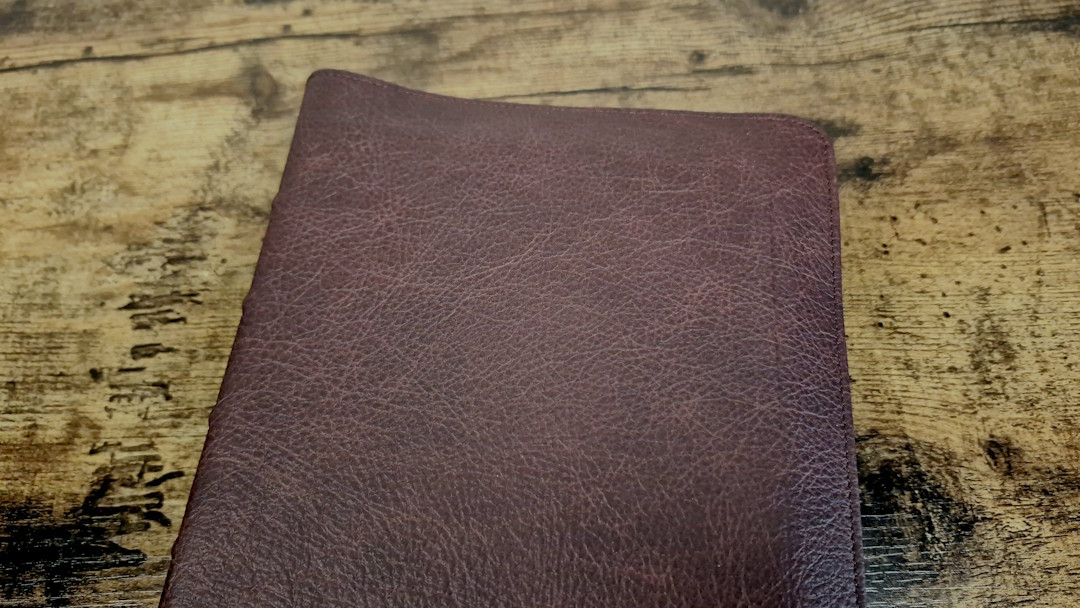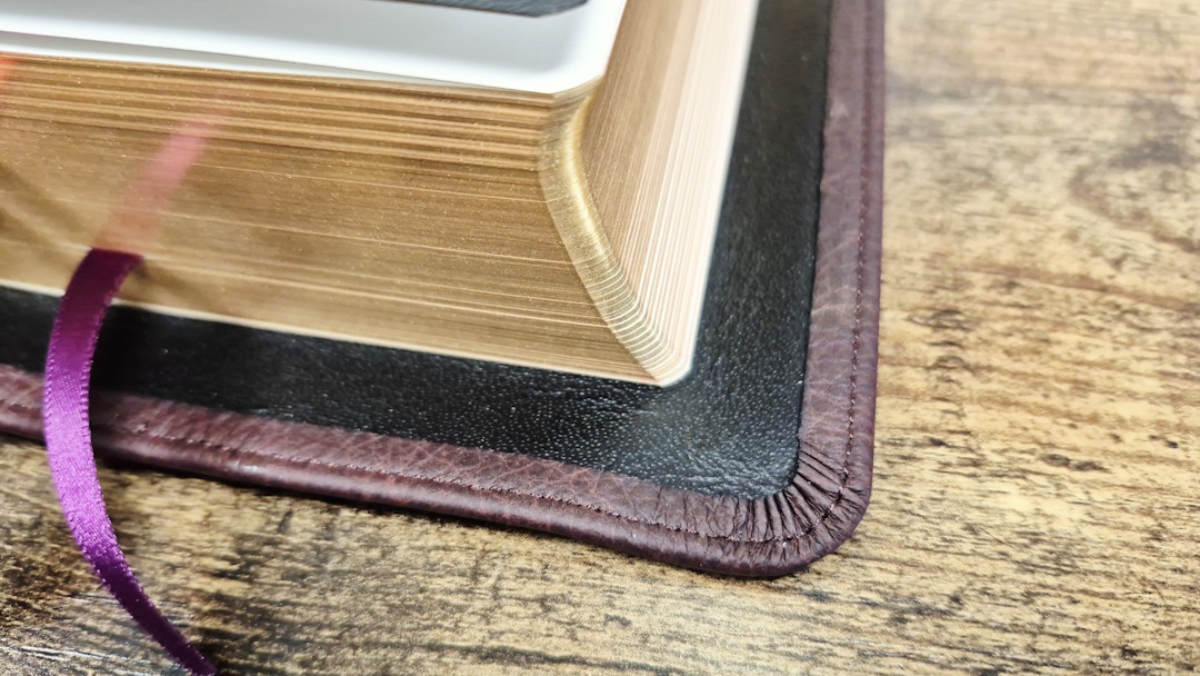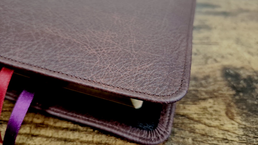 The cover is burgundy Buffalo calfskin and matches the KJV except for the colors. It’s soft and flexible with a thick leather and a full yapp that touches on all sides. Perimeter stitching includes a burgundy thread to match the cover, and an etched line traces around the textblock. It also has a deep grain with a lot of dark color variation. The spine has 5 raised hubs and gold printing. This is my personal favorite of the three covers. It looks and feels the same as the green for the KJV, but I prefer this color.