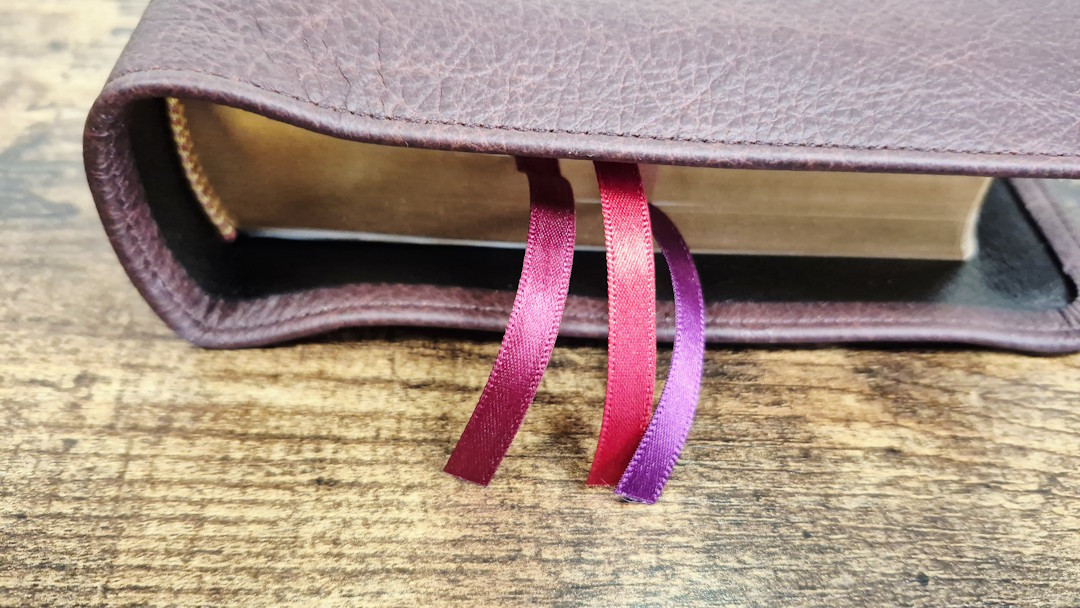 Unlike my KJV, all three of the double-sided Berisfords ribbons are 1/4″ wide, which is a good size for the Clarion in my opinion. Each has a different shade of red/burgundy/wine that looks great with the burgundy cover. They’re also straight cut and long enough to pull to the corner to open the Bible. The head/tail bands are yellow and red.
