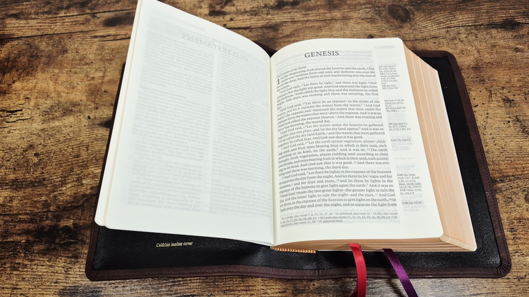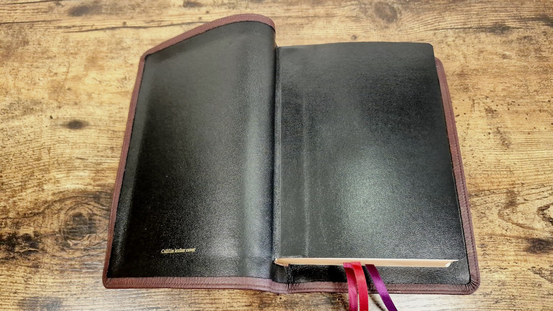 The edge-lined liner is black leather with excellent corner work. Like the KJV’s cover, it isn’t too stiff and doesn’t close when using it. After it breaks in with use, it should stay fully open at the beginning of Genesis.
