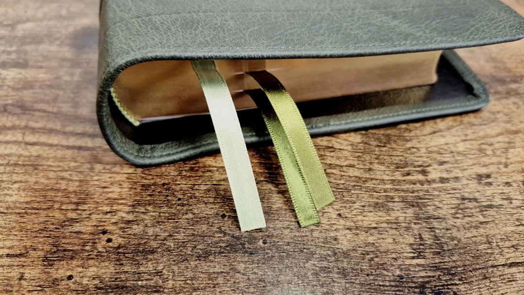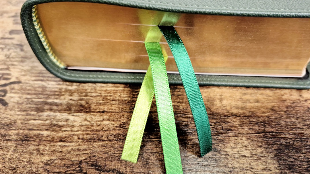 The three ribbons are Berisfords, and they are double-sided satin. Mine has a variation in size. Two are 5/16″ wide, and one is 1/4″ wide. The width fits the overall size of the Clarion. Each has a different shade of muted green that looks great with the cover. They’re straight-cut and just long enough to pull to the corner to open the Bible. The head/tail bands are yellow and green.