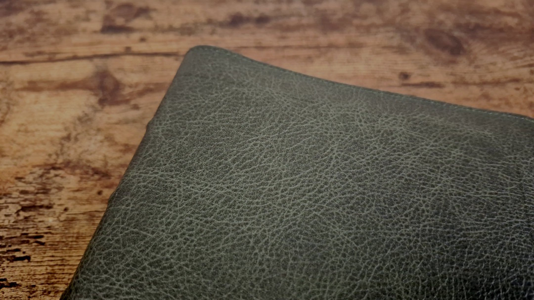 The cover is green Buffalo calfskin with a full yapp. The green is dark, muted green with a hint of yellow, but I wouldn’t call it olive. It’s extremely soft and flexible. The leather is thick, but not too thick. The full yapp touches on all sides and includes perimeter stitching with a thread to match the cover’s color. An etched line traces around the textblock. The grain is deep, with a lot of color variation. This is the kind of grain and color variation that stands out to me, and is easily one of my favorite covers. This cover looks and feels elegant. The spine includes 5 raised hubs and gold printing.