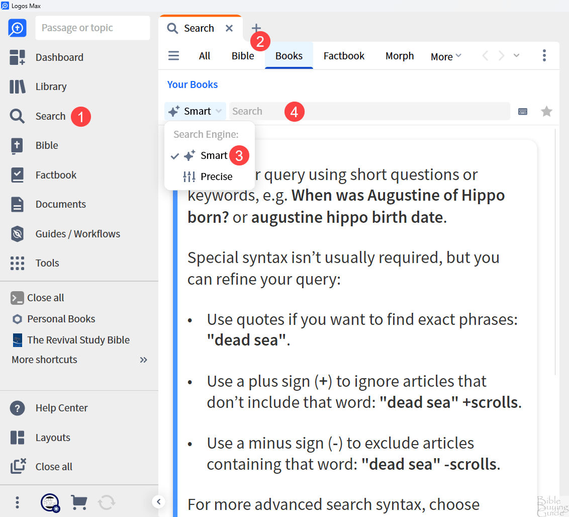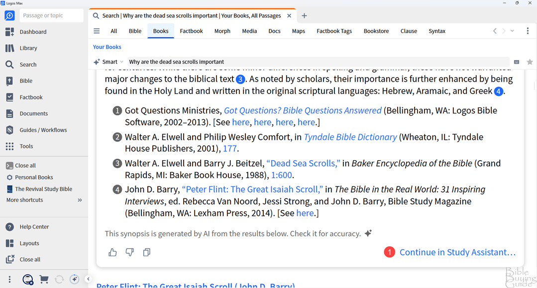 Smart Synopsis is an AI tool that uses your library to find answers to your questions. To use the Study Assistant, go to Search and select Bible or BooksEnsure that Smart is selected as your search engine, and then enter your search query.
