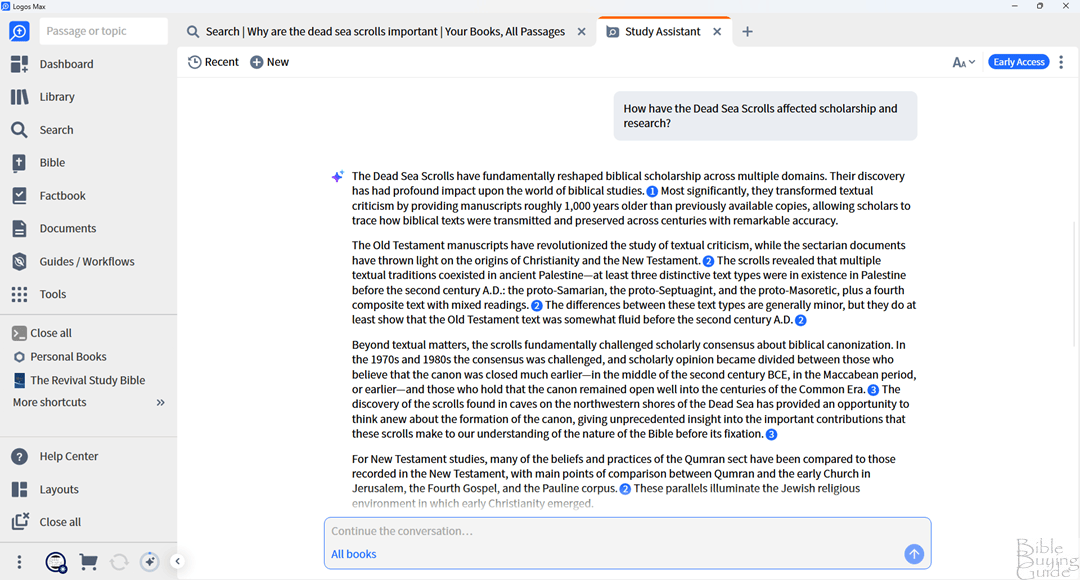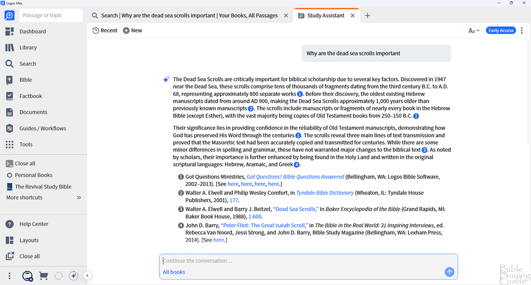 In the upcoming release, Logos is bringing the highly requested Study Assistant feature, which allows you to continue the conversation with Smart Synopsis by asking follow-up questions to delve deeper into biblical and theological topics. This new tool uses AI to search your personal Logos library, analyze the results, and generate cited answers, giving you a powerful research tool that won’t try to write your essay like a general AI chatbot.