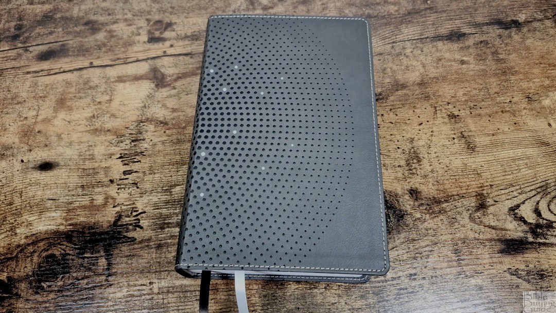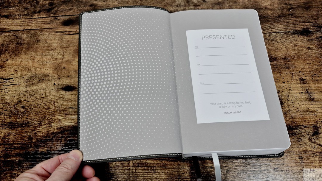 The cover is brown leathersoft (imitation leather). Although it does have a lot of gray in the brown. It includes a circular dot design that’s mostly dark dots with a few white dots, light brown thread for the perimeter stitching, and white text on the spine. The liner is paste-down with a thick paper that includes the dot design and doubles as the presentation page. It includes two ribbons in very light blue and dark brown. The overall size is 5.75 x 8.75 x 2.25 inches, and it weighs 2 lbs, 11.8 oz.