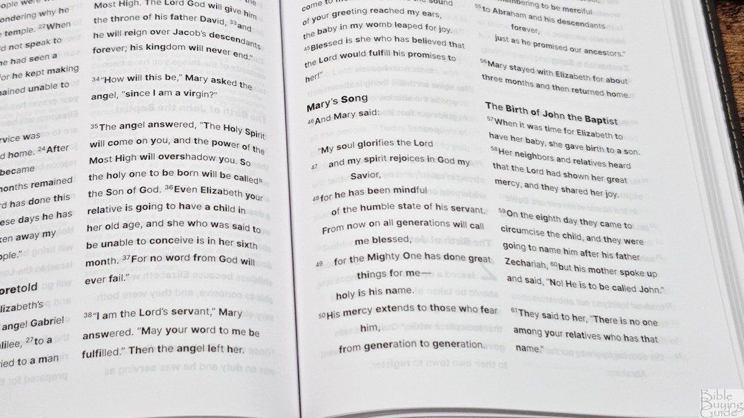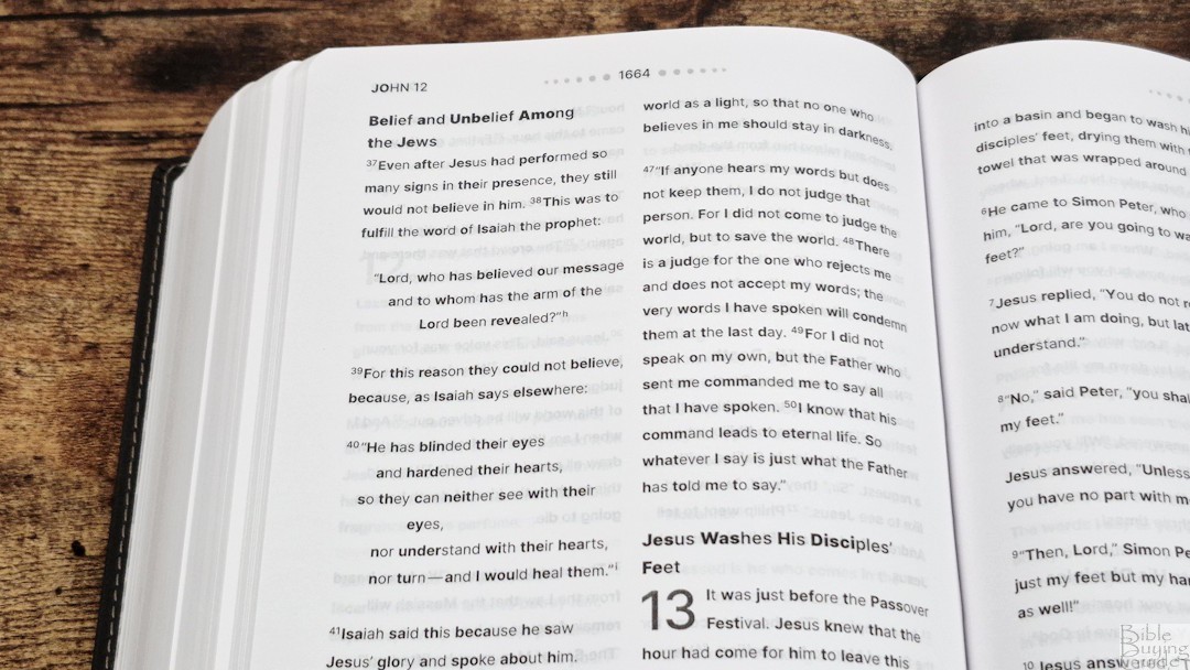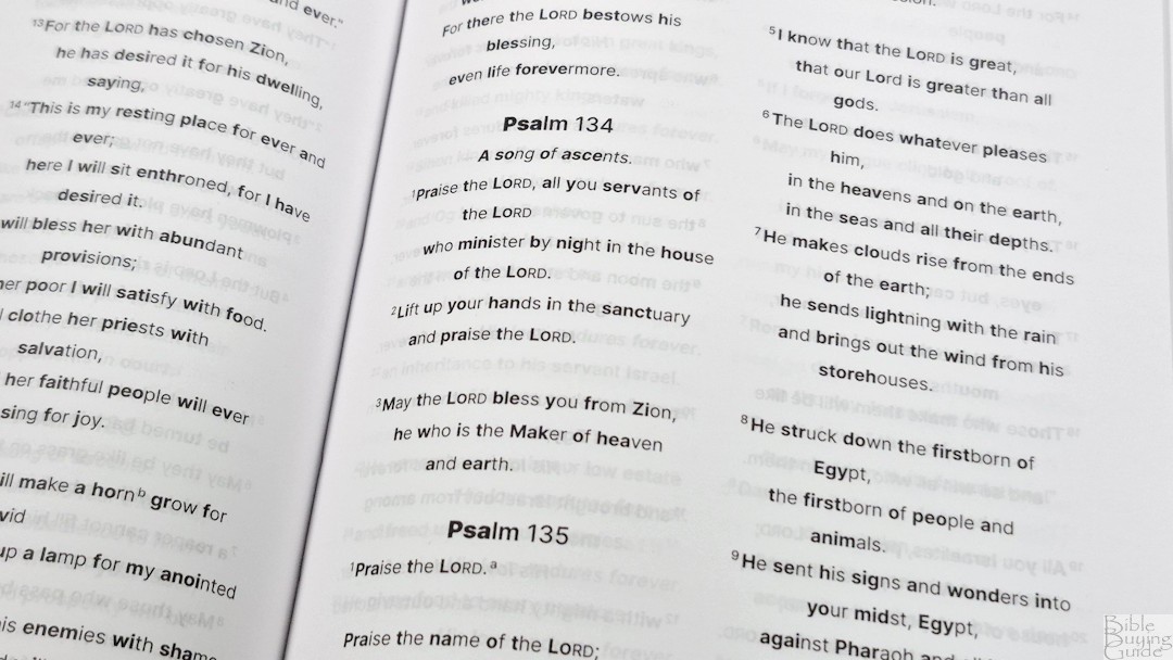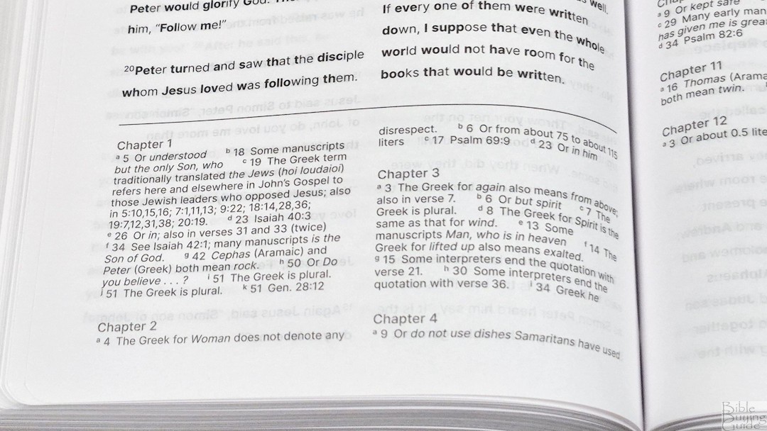The translation footnotes are placed at the end of each book. They’re placed under a heading for each chapter, have extra space between them, and include the reference key and verse number so they’re easy to find. I like that they’re not placed on the page to remove the distraction. They’re easy enough to find, but you have to turn to them.