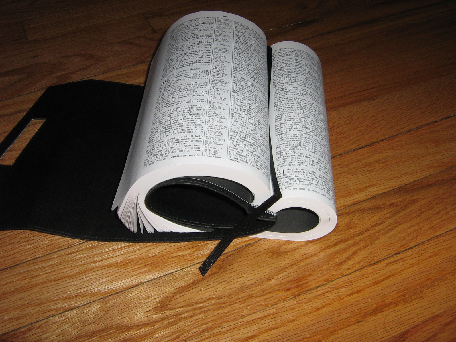 The edition handles the contortions well; only time will tell if the glued binding holds up to the strain of being folded over in such a manner. The layout manages to stay clean and uncluttered without a cramped or minimalist look, but this results in a Bible over 15 inches wide when laid open which may make the flexibility necessary for those who choose to curl the cover behind the back.