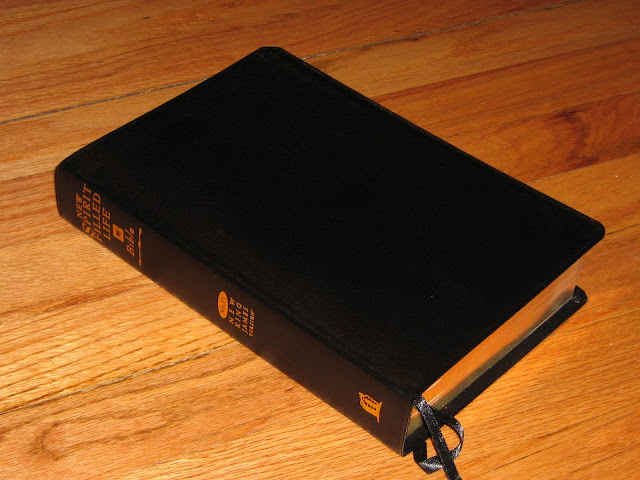 The double column, verse per line format divided by a center column of references retains traditional sensibilities and continues to promote a reference-ready format versus a general reading layout. The font of the text is a serif 8/9 pt font, which is fairly readable but somewhat narrow compared to other fonts of the same size. The references are quite readable in a sans serif font and the study notes at the bottom have the same clear type. The paper in this edition is fairly thin, which allows for the portability and light weight of the Bible, but promotes some significant ghosting and wrinkling.